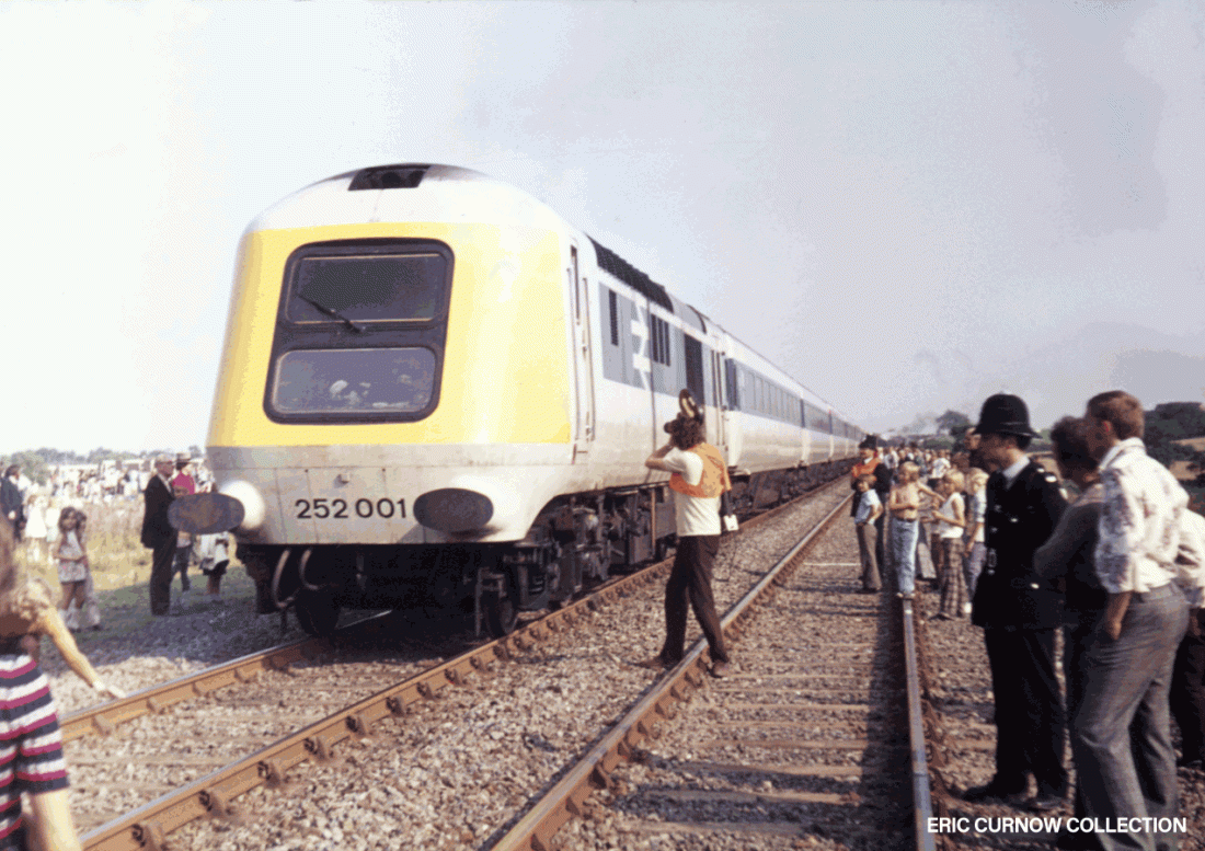 A cameraman zooms in on the double arrow logo on the side of 252001 – the High Speed Train prototype – at the Rail 150 Cavalcade at Shildon, County Durham; portending the new face of future travel. Police keep a watchful eye to ensure life is not endangered by the public approaching too close. 750731A01-UNK-2~001-PARKD
