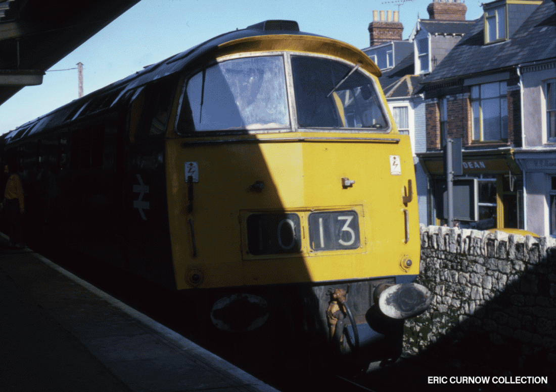 In the final month or two of its BR service, D1013 “WESTERN RANGER” is caught between sun and shade at Weymouth Station. Its bufferheads show remnants of recent Works attention to the loco and a boy is caught proudly posing beside its nameplate. 7702#AA01-WEY-D10##-PAS_D