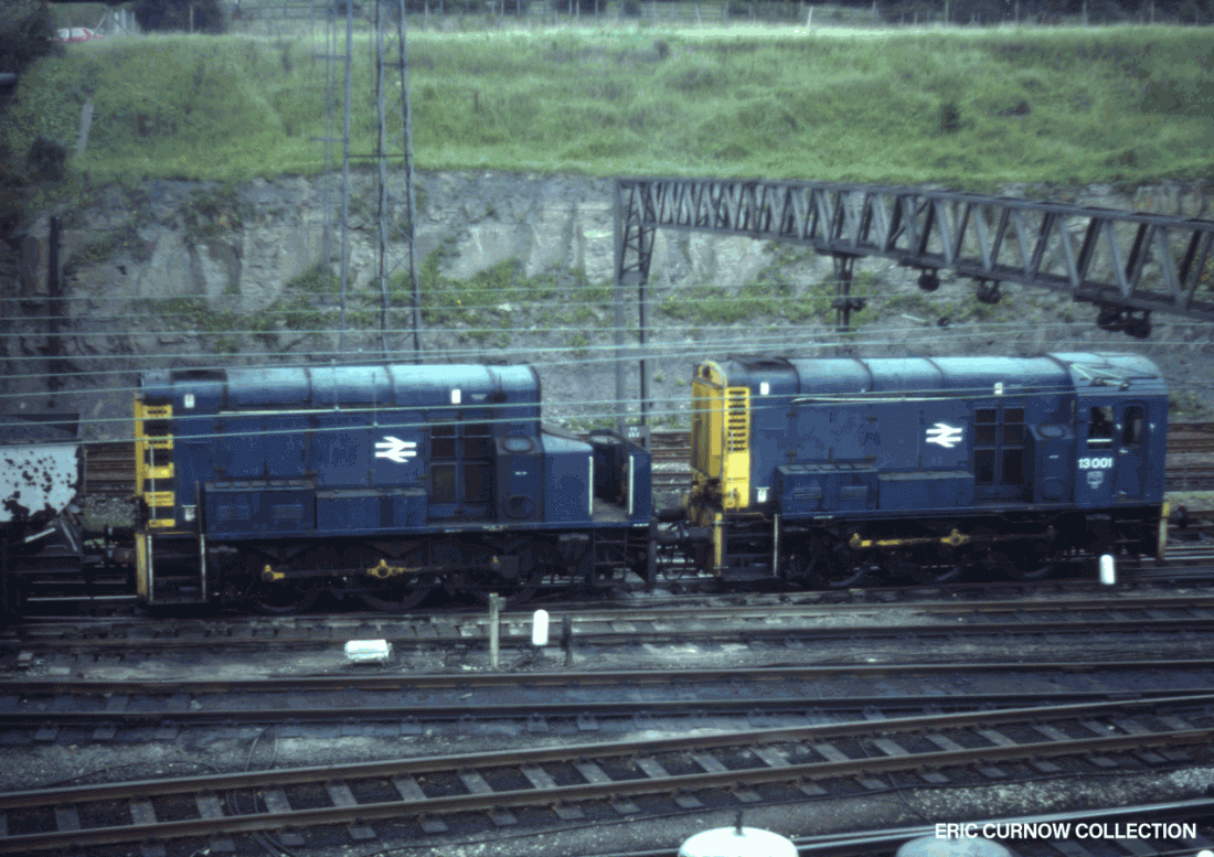 I was never been quite certain whether this small class of shunters was a single or dual traction unit – formed from two Class 08 shunters modified and locked together to form a more powerful combination for larger-scale shunting, such as that required for pushing large numbers of wagons “over the hump” at Tinsley marshalling yard, where this picture was taken. 800813A01-TIN-13001-SHNTG