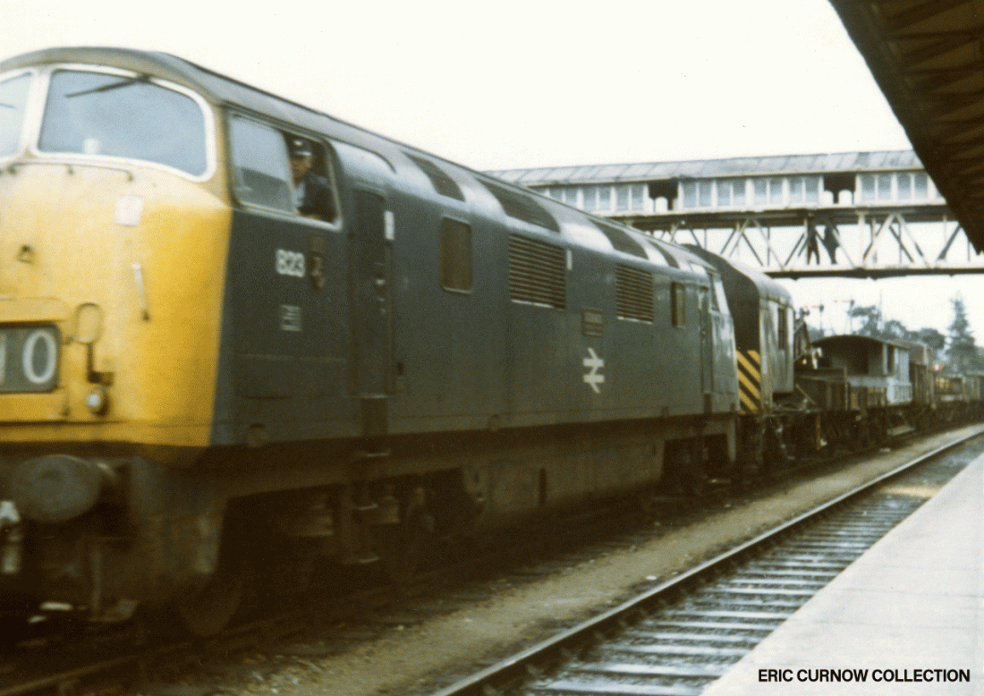 The driver of an engineers train headed by 823 “HERMES” – displaying the crest given to it by the warship of the same name beside its number – is passing through Hereford Station, overlooked by a footbridge apparently stripped of lower panels. 7008#AA01-HFD—D823-MNTCE