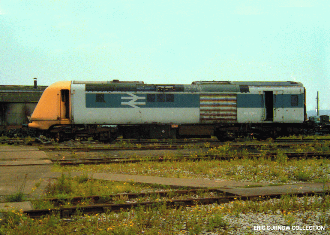 One of the power cars of the prototype High Speed Train languishes in a siding at BREL Derby, with its engine and roof panels removed, prior to disposal. The set visited Penzance on one occasion, though I never saw it myself there. It was eventually restored and preserved. 8####BD02-UNK-41001-SCRAP