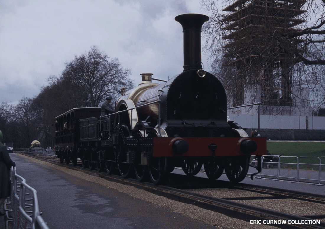 Rails creak as the colossal bulk of the replica of broad gauge GWR “IRON DUKE” slowly rolls along track beside the Albert Memorial in Hyde Park, London. I used to pass this frequently on my walking commute to work and would occasionally deviate to pass it. 8504#AB01-HYP-I_DUK-PASSR