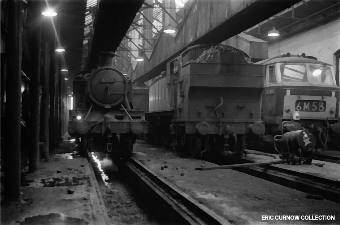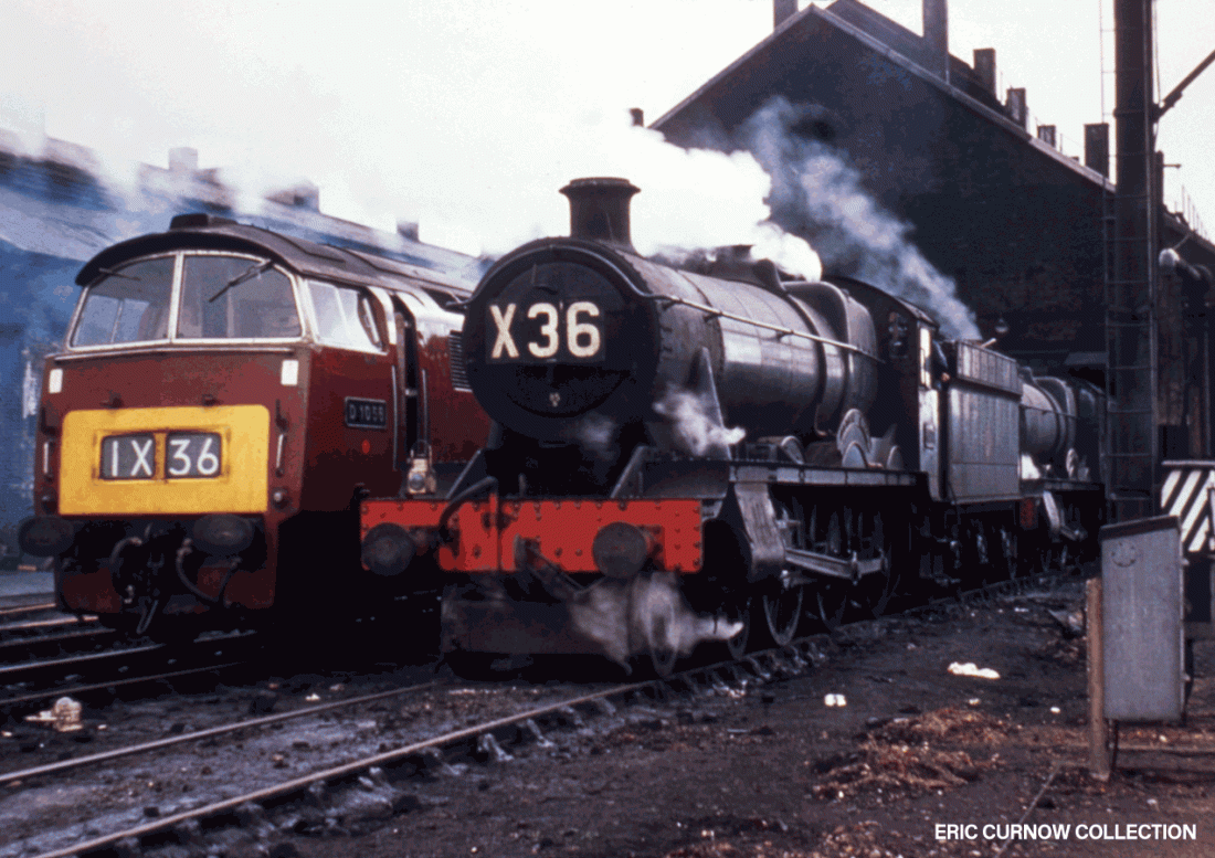 Smoke drifts across maroon-liveried Class 52 D1056 ‘WESTERN SULTAN’ and steam locos, including 6993 ‘ARTHROG HALL’ sporting huge headcode characters, wait outside Gloucester Horton Road Steam Shed, facing the station, in 1963. 63###AE01-GHR-LOCOS-PARKD