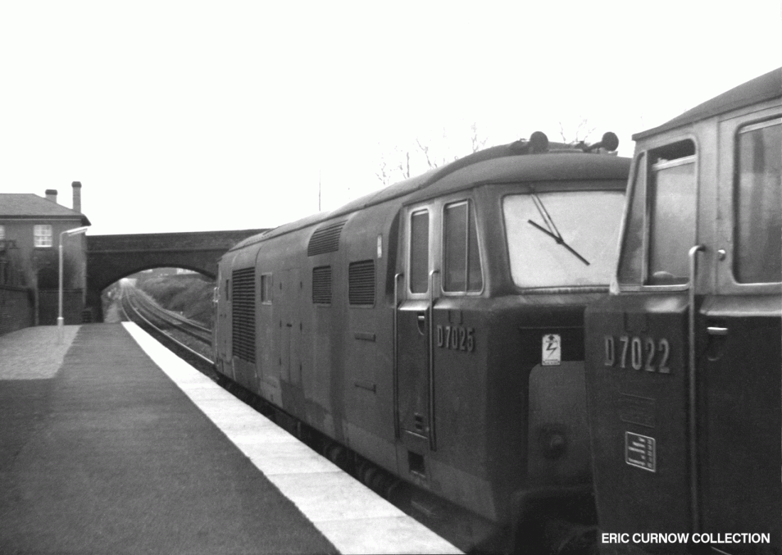 A sufficiently unusual sight to draw many enthusiasts is D7050 at Southampton with a special, taken by Peter Noonan in February 1969. A SR unit passes, and distinctive concrete lamp posts separate them – with a pylon behind, and office block beside the loco. 6902##A01-SOU-D7050-PAS_D
