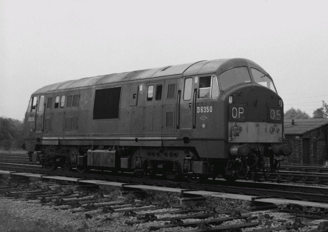 This picture of D6350 was taken at Kennington and, unusually, it has a station pilot headcode – perhaps having worked up from Paddington. The rails of a line of track before it has been lifted, and rather a lot of points rods are amassed between – with a workman’s hut behind. 660706A01-KEG-D6350-LIGHT