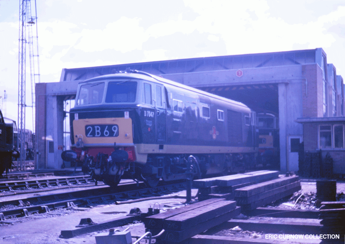 In pristine condition and with buffer heads barely marked, D7047 and shedmate are parked at recently completed Landore depot, Swansea, in the early to mid 1960s. To the left is an 08 shunter, another Hymek and D63XX, and the right, sleepers, brake blocks and a heavy duty hose arrangement. 6####HK01-LRE-D7047-PARKD