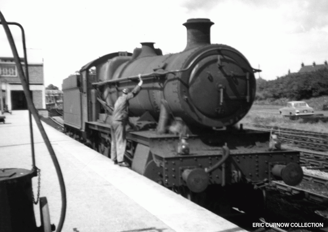 A driver inspects a ‘Hall’ class loco parked up at a platform of Banbury Station in August 1965. It has lost its nameplate, numberplate and smokebox door number, though it has retained its shed plate. The bunker is full and it awaits its next duty. 6508#AA01-BAN-SLOCO-PARKD