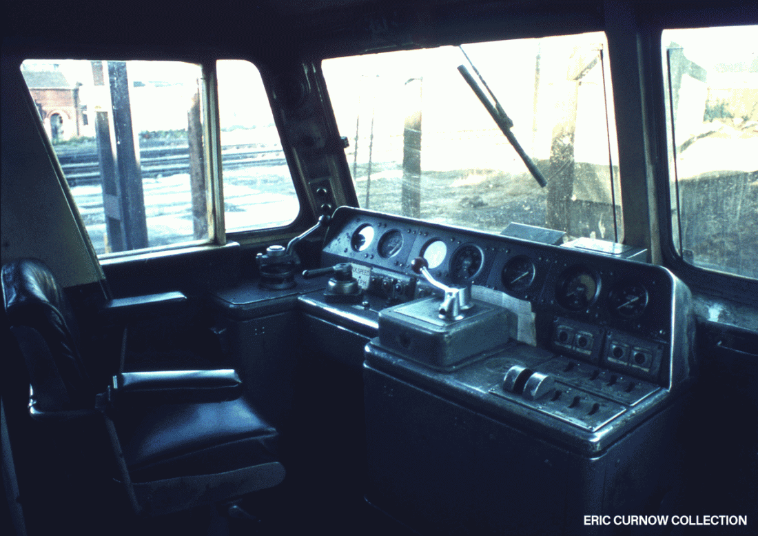 The interior of the cab of D1657 at Birkenhead in 1973. Like the loco itself, everything is functional, well designed and pleasing on the eye. The control desk is very solid and carefully laid out, and even the angle of the strut beside the driver matches the windscreen’s. 73###AA01-BKD-d1657-PARKD