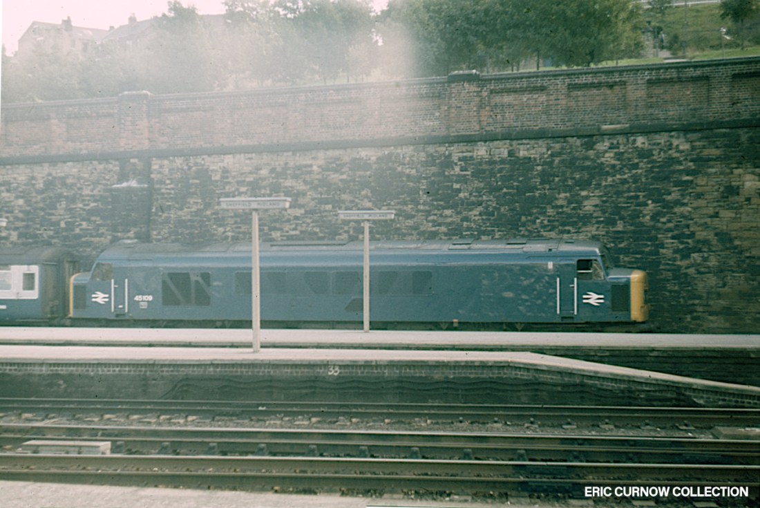 55007 “PINZA”, 55022 “ROYAL SCOTS GREY”, 55006 “THE FIFE & FORFAR YEOMANRY” and a couple of 31s are parked at the side of Finsbury Park Depot awaiting reuse in service. “PINZA” has the white window surrounds typical of FP-allocated ‘Deltics’. 791226A01-FPK-55007-PARKD